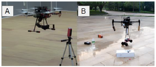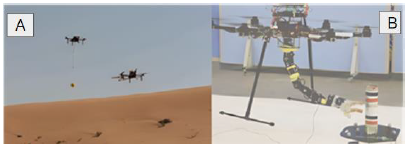 Sometimes one robotic arm is not enough to grasp and manipulate complex shapes [60] have developed an unmanned aerial system with dual manipulator (see Fig.8 -A) to detect, estimate, track and grasp an object; a convolutional neural network, a random sample consensus algorithm and an extended Kalman Filter are employed to detect and estimate the object pose; besides, a position-based visual servoing is used to guide the arms to the target. Moving objects can be convey over UGV [61] present two independent controllers for a robotic arm and a UAV of an aerial manipulator capable of grasping moving objects (see Fig.7 -B).