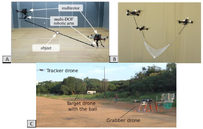 [63] present a method to throw and catch a ball with a fleet of UAVs attached to a net, using a motion-tracking system to measure the position and attitude of each UAV; moreover, the problem is simplified by throwing the ball vertically (see Fig.9 -B).