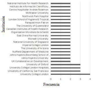 En cuanto a las instituciones, la principal es la University College London, seguida de University of California, San Francisco, University College London Hospitals NHS Foundation Trust y University of Oxford (ver Figura 2).