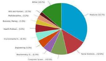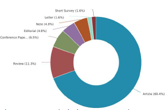 En relación con las revistas, los títulos con mayor número de artículos son Scientometrics, International Journal of Environmental Research and Public Health y Nature (ver anexo 1). Destacan las revistas en el área de la medicina, seguida de ciencias sociales y ciencias de la computación (ver Figura 3). En cuanto al tipo de documento, el mayor porcentaje lo ocupan los artículos, seguido de revisiones y artículos de conferencia (Ver Figura 4).