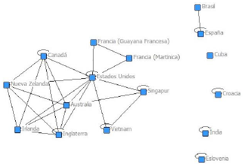 En la red se observan seis componentes o subredes. En el principal Estados Unidos es el nodo con mayor grado o número de vínculos directos. Ese país también actúa como punto de corte de la red [36], esto es, si ese nodo desaparece de la red, la subred se fragmentaría en dos partes y aumentaría el número total de componentes de la red. Para Francia se observa la cooperación entre dos departamentos de ultramar (Guayana Francesa y Martinica), conectados igualmente al resto del componente a través de Estados Unidos. Esto muestra el rol de este último como articulador de la red de colaboración. De los otros cinco componentes, en cuatro se presenta colaboración nacional, y en uno no se da colaboración.