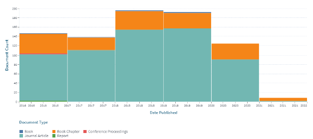 Por otro lado, empleando el motor de búsqueda Lens Org, se usó la frase "Iron oxide catalysts to produce carbon nanomaterials", eligiendo las obras académicas y un filtro temporal a partir del año 2016. Se obtuvo como resultado 804 obras académicas. La Figuras 1 y 2 resumen los resultados bibliográficos utilizando la metodología propuesta.