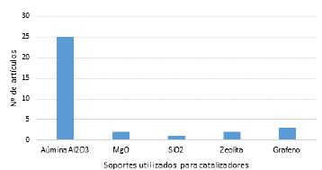 En este contexto, la revisión bibliométrica, destaca el uso del soporte de alúmina (ver Figura 4), debido a su fuerte interacción metal-soporte, alta dispersión de metal y alta densidad del sitio catalítico, aumentando el rendimiento de los nanotubos de carbono [66]. También se reportó el uso de soportes porosos como el óxido de magnesio y la zeolita, con el fin de que las nanopartículas del óxido de hierro utilizadas tengan una dispersión más uniforme sobre el soporte y haya poca o nula aglomeración [67]. La desventaja de estos soportes es la cantidad de carbono amorfo que tiende a acumularse en los poros de los materiales porosos después del proceso de pirólisis, lo que hace necesario un paso adicional de purificación para obtener la nanoestructura de carbón [68].