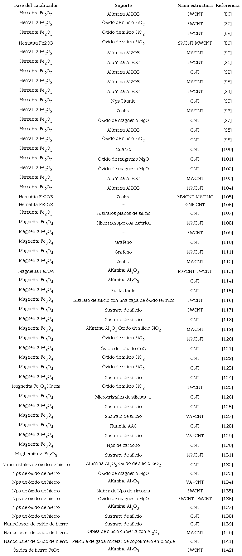 Es importante mencionar que, la revisión bibliográfica basada en artículos científicos destaca, principalmente, el uso de las siguientes fases de óxidos de hierro como catalizadores en el proceso de síntesis de nanoestrucutras de carbono por el método de pirólisis: la magnetita (Fe3O4), la hematita (α-Fe2O3), y la maghemita (y-Fe2O3).