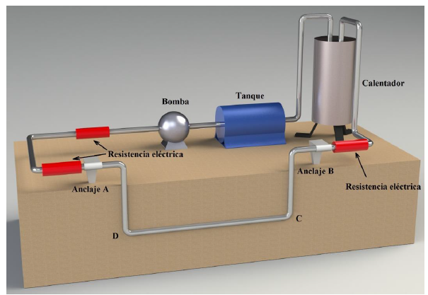 Tres resistencias adicionales compensan la pérdida de calor de la tubería en el tramo enterrado, permitiendo que el circuito alcance una temperatura estable. El resto de la tubería se encuentra aislada con fibra de vidrio para minimizar las pérdidas térmicas. El presente arreglo permite calentar la tubería hasta alcanzar una temperatura de 55 °C. El banco está instrumentado con galgas extensométricas, termocuplas y manómetros para la medición de las deformaciones y la temperatura en la tubería, el suelo y el ambiente durante las pruebas.