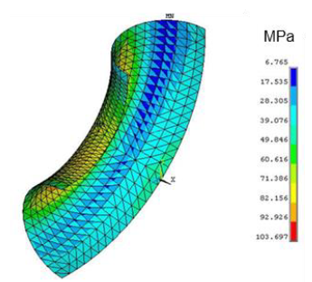 Sin embargo, la variación en el esfuerzo máximo es de menos del 0,5% en el rango estudiado. La comparación numérica de los experimentos se muestra en la Figura 10, donde se tiene una gráfica del esfuerzo equivalente de von Mises en el codo para una condición de carga térmica de 30 °C, en esta se puede observar que los esfuerzos en el codo, arrojan un valor de 103 MPa, lo cual es muy cercano al valor de 100 MPa determinado experimentalmente para el caso de carga monotónica con el suelo virgen, lo cual demuestra una excelente capacidad predictiva para el modelo.