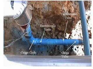 La Figura 2, muestra la ubicación de galgas en el codo (Punto C) y en la tubería, y las termocuplas para medir la temperatura del tubo y del suelo durante el experimento. La galga en el tramo recto de la tubería se ubicó a una distancia de 50 cm (10 diámetros nominales) de la línea centroidal del codo. Las galgas empleadas fueron del tipo 202YMR3-45ESTK de 120 Ohms y factor de galga, FG=2,02 fabricadas por Dentronics para trabajar a alta temperatura y autocompensadas térmicamente.