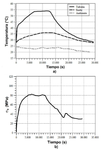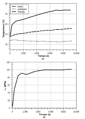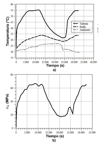Como un primer paso, se midió el esfuerzo en el codo cuando éste se encontraba al descubierto (sin arena) mientras el resto de la tubería estaba cubierta. Esta prueba se realizó con la finalidad de minimizar el efecto que la restricción impuesta por el suelo restante y poder comparar con el modelo numérico. En la Figura 3 se muestran los resultados obtenidos para el caso de carga térmica monotónica para el codo descubierto. La Figura 3 a, muestra la temperatura de la tubería, el suelo y el ambiente en función del tiempo, y la Figura 3b muestra la variación del esfuerzo equivalente en el codo a través del tiempo.