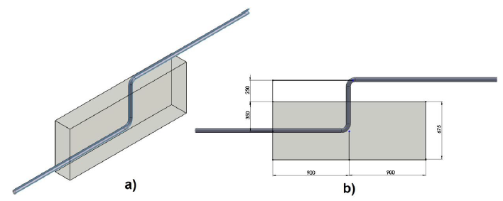 Este modelo corresponde a las pruebas experimentales realizadas en las que parte del suelo ha sido deformado previamente a enterrar el codo de la tubería. Las dimensiones de la porción de suelo, la profundidad a la que la tubería ha sido enterrada y la altura de afloramiento con respecto al nivel del suelo se muestran en la Figura 6b. Las dimensiones del volumen de suelo fueron seleccionadas basadas en el hecho de que éstas definiesen el dominio de influencia del problema.
