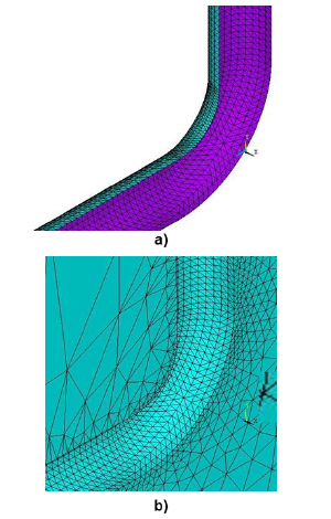 El suelo se modeló con elementos sólidos tetrahedrales, y elementos triangulares tipo Shell para la tubería, tomando en cuenta el espesor de la misma en la definición del elemento. Posteriormente, se llevó a cabo un análisis de convergencia, obteniéndose un modelo con 425.620 grados de libertad. El análisis de convergencia se detuvo al alcanzar una variación en los esfuerzos máximos del 0.6% para la tubería y 2% para el suelo. La Figura 7 muestra detalles del mallado por elementos finitos en el codo y en la zona del suelo cercana, que es la zona donde ocurren las mayores deformaciones del mismo.