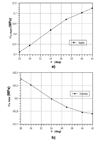 El ángulo de fricción tiene relativamente poca influencia sobre el esfuerzo máximo en el codo enterrado de la tubería, con variaciones que no superan el 1% para todo el rango de ángulos de fricción estudiado y que comprenden los valores típicos de los suelos arenosos.