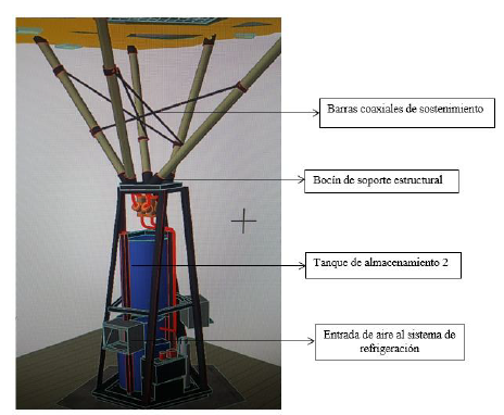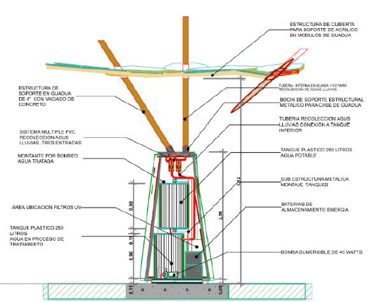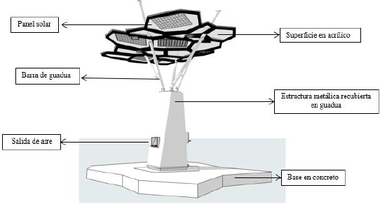 Como es detallado en el análisis QFD, la estructura tendrá forma de árbol con dos tanques de almacenamiento en su interior cada uno con una capacidad de 250l cada uno, el agua de lluvia y humedad entrante al sistema ingresa al tanque de la superficie inferior y es bombeado al tanque superior donde pasa previamente por un filtro de carbon activado, esta agua disponible puede ser enviada a un tercer tanque de almacenamiento o ser usada a través de un grifo con funcionamiento por gravedad a través de uno de los orificios ubicados en los costados de la estructura, orificios por los cuales entra y sale el aire del sistema de refrigeración. La estructura cuenta con una caja negra de almacenamiento de los equipos del sistema fotovoltaico (Baterías, etc.) como puede apreciarse en la Figura 8. Cabe destacar que la estructura cuenta con un anclaje al suelo con concreto, con el fin de garantizar la estabilidad estructural.