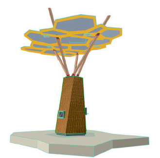 La Figura 10 muestra las entradas del prototipo en 3 dimensiones. El ciclo de refrigeración que genera 24 litros de agua diario que van directamente al tanque inferior proporciona un abastecimiento pequeño pero constante diariamente que es útil en los meses del año que presentan poca precipitación. El diseño piramidal de la estructura metálica nace de una base pentagonal solo con el fin de realizar un modelo con características estéticas y siguiendo la hegemonía de un árbol con una base gruesa que va disminuyendo su grosor como muestra la Figura 11.