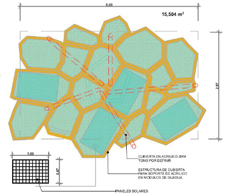 Con la finalidad de tener un diseño conceptual, se procedió a darle forma en el software de modelado Solidwork [24]. Inicialmente se planteó un rectángulo de 5.2x3.0 m de los cuales se fue dando forma de hojas de árbol. Desde la vista superior, podemos apreciar la geometría como muestra la Figura 3.