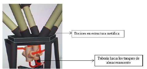 Por otro lado, y teniendo en cuenta que la superficie colectora brinda dos aplicaciones al sistema (colectora de agua lluvia y superficie para los paneles solares), se emplea la estructura de soporte (las barras en guadua sellada) como conductos de distribución del agua lluvia desde la superficie colectora hasta los tanques de almacenamiento, las barras de soporte están unidas entre sí a través de barras metálicas que garantizan un mayor soporte en la estructura como muestra la Figura 6. En la Figura 7, podemos apreciar los bocines de soporte en la estructura y la tubería de conexión a los tanques.