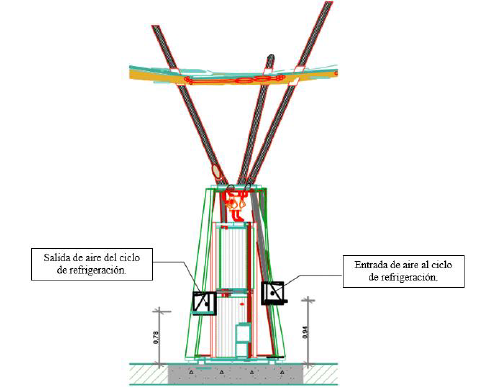 La entrada y salida del aire del ciclo de refrigeración por convección natural está dispuesta en los laterales como muestra la Figura 9, a través de los orificios también se podrá disponer mangueras para el uso y distribución del agua potable por medio de un grifo común.