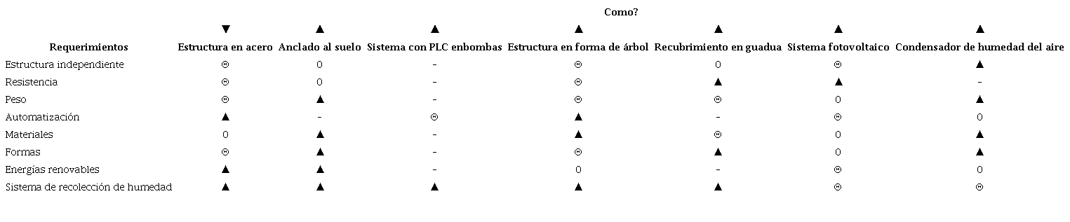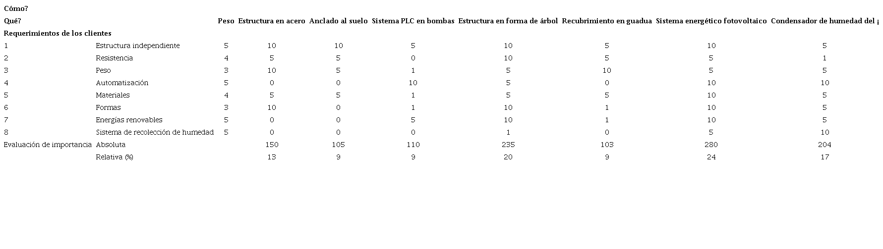 Con valores la matriz obtenida anteriormente, se obtiene la Tabla 10, donde podemos apreciar en la que debemos centrarnos para el buen desarrollo del diseño. En el texto marcado en color rojo podemos apreciar el valor absoluto de los resultados que nos muestra el peso o valor de importancia de cada ítem en el diseño. Podemos observar que los 3 valores más altos son para estructura en forma de árbol con 235 puntos o un 20%, sistema energético fotovoltaico con 280 puntos o un 24% y un condensador de humedad del aire con un valor de 17 puntos o 17% valores resaltados en la tabla en los que debe centrarse el diseño [22], [23].