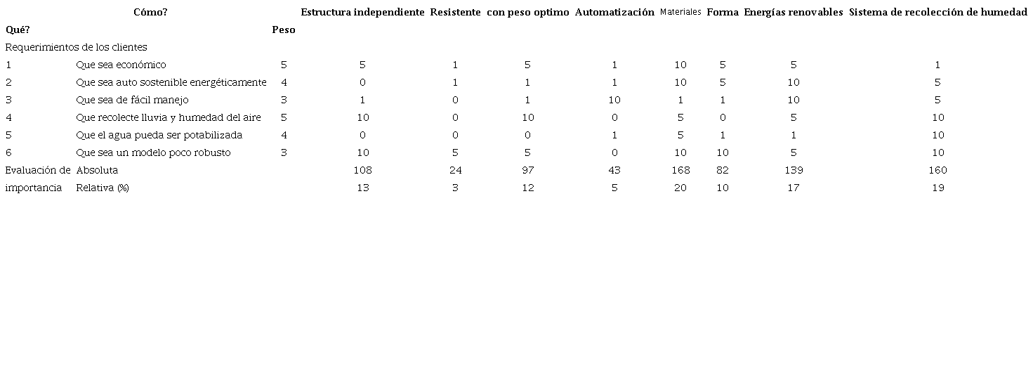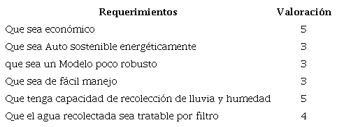 El diseño del colector fue desarrollado para campesinos y trabajadores en zonas rurales del municipio de la Playa Belén teniendo en cuenta los siguientes requerimientos: Prototipo económico, Poco robusto, Auto sostenible energéticamente, Recolecte lluvia y humedad, Agua tratable a través de filtros y de Fácil manejo. Cada requisito tiene un valor o peso de importancia que varía de 1 a 5 de la siguiente manera, 1 poca relevancia - 5 altas relevancias como muestra la Tabla 2. Es importante mencionar que la valoración establecida para cada requerimiento es determinada por el cliente en función de la importacia de las especificaciones.