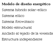 Con los requerimientos de los clientes estipulados se detallaron cada uno de los aspectos técnicos a tener en cuenta que se dividieron en dos categorías (modelo de diseño energético y modelo estructural) como muestra la Tabla 3 y 4. En el modelo energético se plantearon tres escenarios los cuales cumplen el requisito de independencia energética en los cuales se evaluará un modelo hibrido solar-eólico, un modelo con sistema eólico y un modelo con un sistema fotovoltaico. Para el modelo estructural se plantearon dos alternativas las cuales cumplen el requisito de recolección de agua, la primera usa la superficie del tejado de la casa como fuente de recolección de agua lluvia (incluyendo un espacio para los intercambiadores que recolectaran la humedad) y soporte para el sistema energético, la segunda opción plantea un modelo estructural independiente el cual tendrá una superficie recolectora de lluvia, espacio para el sistema de refrigeración y espacio para el sistema energético.