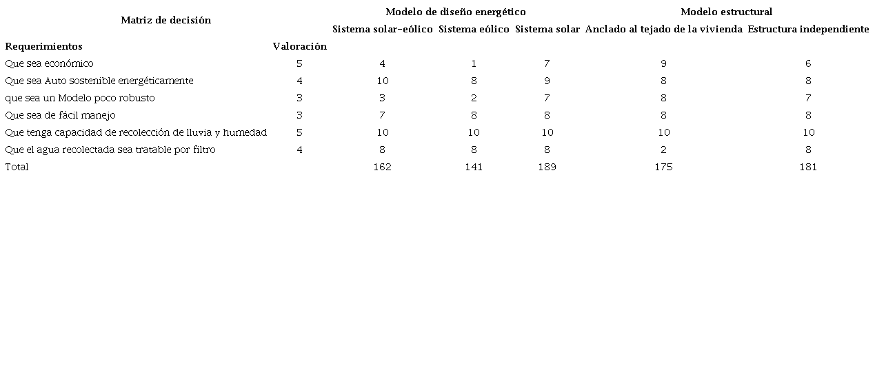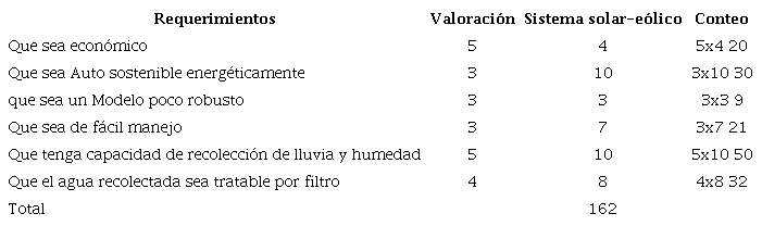 Teniendo en cuenta todos los requerimientos y criterios se desarrolló la matriz de decisión considerando que cada modelo energético y estructural se evaluó en una escala de 1 a 10 y se multiplico por la valoración de cada requerimiento, luego se sumaron cada uno de los valores de la siguiente manera: En el modelo de diseño energético para el sistema hibrido solar-eólico se evaluó así. Para el requerimiento de economia su calificación fue 4 debido a los altos costos multiplicado por su valoracion y asi cada ítem para luego sumar todas las columnas dando un ponderado de 162 como muestra la Tabla 4.