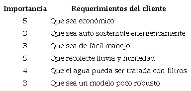 El proceso de traducción de requerimientos a especificaciones de ingeniería se llevó a cabo mediante la identificación de los requerimientos del cliente y su posterior desglose en aspectos técnicos medibles y con valores objetivos. Esto se realizó en dos fases: la primera fase consistió en identificar los requerimientos del cliente, que incluyen aspectos como el costo, la sostenibilidad energética, la facilidad de manejo, la capacidad de recolección de agua de lluvia y humedad, y la capacidad de tratamiento del agua recolectada. Estos requerimientos fueron valorados por su importancia en una escala del 1 al 5, siendo 5 la mayor importancia y 1 la menor.