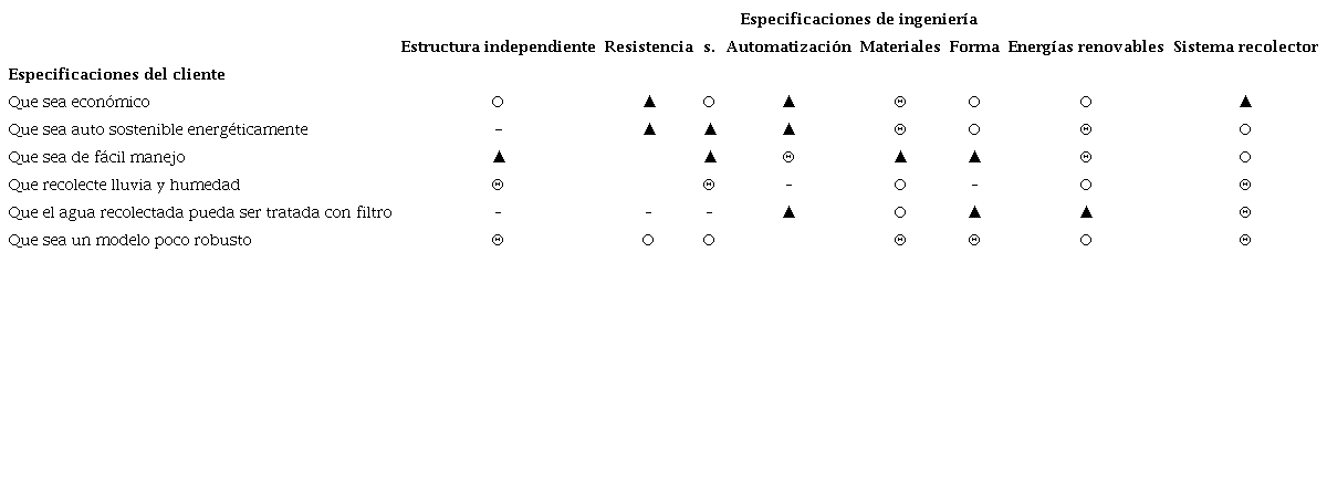 Con la matriz de decisión planteada, podemos organizar las especificaciones técnicas iniciales que cumplan con los requerimientos como muestra la Tabla 7. Dónde: Θ indica una correlación alta entre la especificación del cliente y la especificación de ingeniería que se califica como un 10, O indica una correlación media entre la especificación del cliente y la especificación de ingeniería que se califica como un 5, y ▲ indica una correlación baja entre la especificación del cliente y la especificación de ingeniería que se califica como un 1.0 [21].