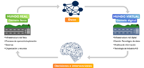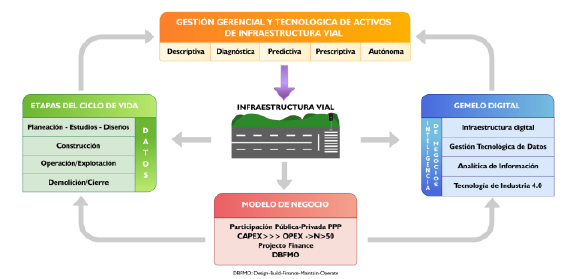 Ahora bien, el diseño incorpora un componente novedoso, consistente en la tecnología disruptiva de gemelos digitales "Digital Twins" dentro de la transformación industrial 4.0 aplicada al sector de infraestructura vial; entonces surgen nuevos conceptos en el modelo de gestión denominados de manera equivalente como "Digital Roads", "Smart Roads", ó "Digital Twins for Roads", para articular y administrar toda la información de los procesos con la tecnología apropiada y así ofrecer a los agentes o partes interesadas un entorno gerencial de decisiones informadas y objetivas, en la etapa de operación/explotación de los activos.