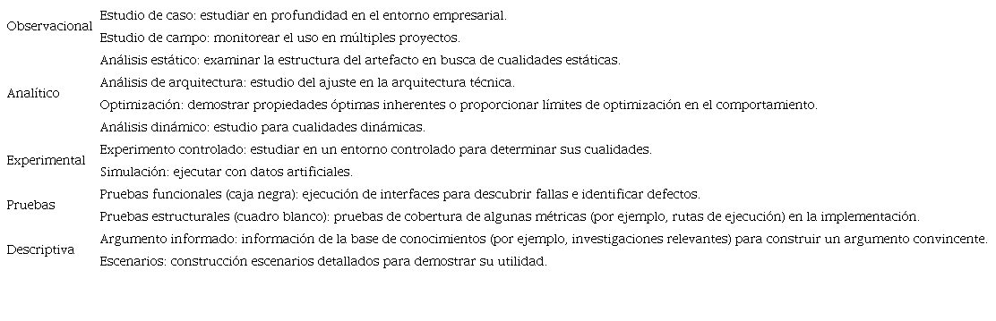 En cuanto al proceso de determinar la viabilidad del artefacto, los métodos descriptivos de evaluación se deben aplicar particularmente en artefactos innovadores que evidencien amplias bondades tecnológicas y de gestión en las disciplinas de ingeniería, ciencias de la información y management; en DSR es importante responder a las preguntas de ¿Que utilidad se obtiene del artefacto? y ¿Que explica ese beneficio? En la Tabla 1 se presentan los métodos de evaluación.