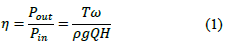 El rendimiento de la turbina se mido en términos de la eficiencia hidráulica (η), la cual puede ser calculada usando la ecuación (1). η se refiere a la relación entre la potencia de salida (Pout) y la potencia de entrada (Pin).