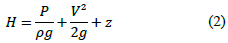 Donde el torque del eje de la turbine, la velocidad angular, la densidad del agua y la aceleración de la gravedad son expresados por T (Nm), ω (rad/s), p (kg/m3) ay g (9.81 m/s2), respectivamente. Además, Q y H son el caudal (m3/s) y la cabeza neta de la turbine (m), respectivamente [25]. H puede ser determinada mediante la ecuación de Bernoulli (Ecuación (2)).