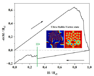 In the Figure 2, we plot the magnetization curve - 4𝜋𝑀 as a magnetic field function H, and the superconducting-electron density of the dominant band ∣𝜓1∣2 (right) and its phase Δ𝜃1 (left) for the ultra-stable-vortex state in the down-branch of the magnetic field at H2> H > H* (Inset). As we can see this curve presents the typical behaviour of a type II superconducting sample, where each jump represents the entry or exit of one or several vortices of the sample. H2 representes the superconducting-normal transition magnetic field and H* = 0.3, the magnetic field where the ultra-stable-vortex state is destroyed. We think that this interesting state is due to the heigh of the topological coupling used betwee the bands.