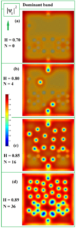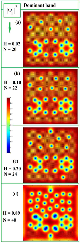 In the same way, In the Figure 4 (a-d) we plot the superconducting-electron density of the dominant band ∣𝜓1∣2, decreasing the magnetic field (arrow down) for a) H = 0.02,N = 20, b) H = 0.10,N = 22, c) H = 0.20, N = 24, and d) H = 0.89, N = 40.