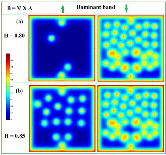 In the Figure 5 (a-b) we plot the magnetic induction B related to magnetic vectorial potential A as, В = ∇ x A, for a dominant band, for a) H=0.80, and b) H=0.85, increasing (arrow up) and decreasing (arrow down) H. We can observe that in the superconductin state the order parameter 𝜓 = 1.0 while de local magnetic induction В = 0 and in the regions where there are vortices 𝜓 = 0 and В = 1.0, result completely in agreement with the already known experimental data.