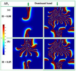 In the Figure 6 (a-b) we plot the phase of the order parameter of the dominant band Δ𝜃1 for a) H=0.80, and b) H=0.85, increasing (arrow up) and decreasing (arrow down) H. When the Kagome-lattice of defects is placed in the sample, the square symmetry is broken and the lattice acts like a pinning center. The phase allows to determine the vortex number in a given region, by counting the phase variation in a closed path around this region. If the vorticity in this region is N, then the phase changes by 2𝜋N.