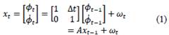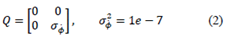 Donde se tiene que ф es la fase de marcha, ф es la velocidad de cambio de la fase, Δt es el paso de tiempo de integración y ωt~N(0, Q). En el cual Q se describe como: