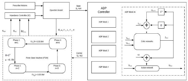 Mediante ajustes al controlador se logró una tasa de éxito del 87% en las simulaciones realizadas, y la velocidad de aprendizaje se estableció en 215 ciclos de marcha. El esquema del controlador basado en programación dinámica adaptativa se muestra en la Figura 2.