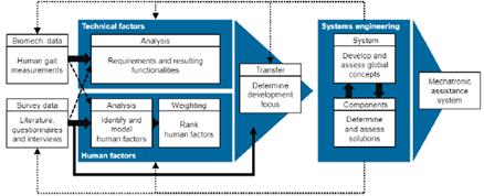 Otra investigación desarrollada a la misma temática buscaba el desarrollo de una interfaz humano- máquina (véase Figura 4) que permitiera el diseño óptimo de prótesis de miembro inferior. Los autores del proyecto encontraron que durante el diseño de los dispositivos protésicos se hacía gran relevancia en los requerimientos mecánicos del dispositivo, pero poca en las características, demandas y aspectos humanos del paciente. Los autores desarrollaron una novedosa metodología de diseño orientada en una interfaz humano-máquina, y la aplicaron en un enfoque en V del diseño de una rodilla mecatrónica activa. En sus resultados la investigación muestra que con base en un análisis de función de calidad (QFD) lograron llegar a diseños de prótesis, que, aunque eran diferentes que las soluciones planteadas actualmente, tenían en cuenta en una alta medida las necesidades del usuario. Los factores humanos tenidos en cuenta en la interfaz de diseño fueron: satisfacción, sensación de seguridad, integración del esquema corporal, soporte, encaje, movilidad y apariencia exterior [86].