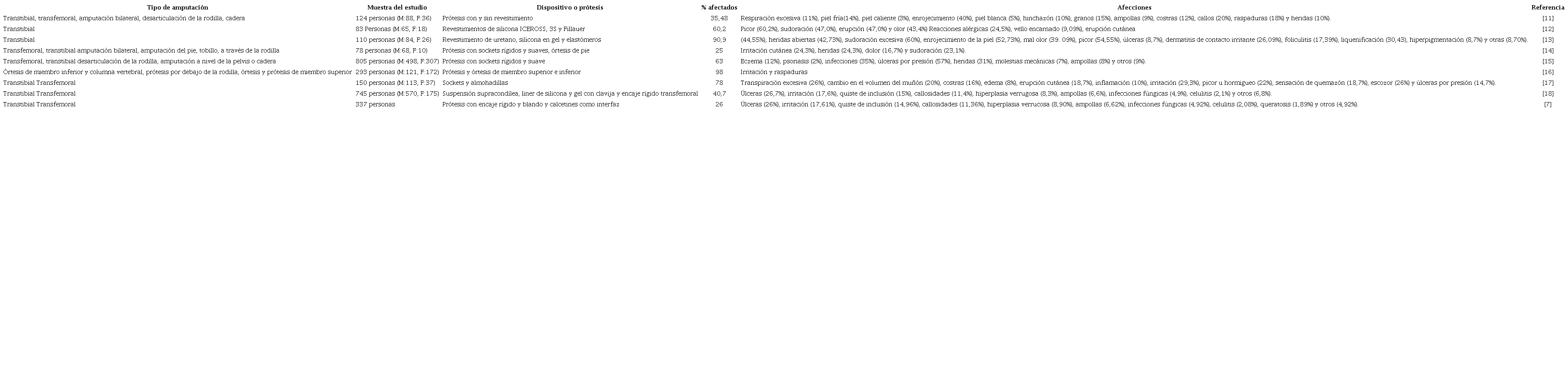 En Colombia para el año 2022 se reportan un total de 9.829 heridos debido a minas antipersonas [6]; complementando las 63.000 personas que para el año 2015 presentaban afecciones del miembro inferior, relacionadas con parálisis o pérdida [4]. Para estas personas, los dispositivos protésicos del mercado fallan en satisfacer sus requerimientos, presentando molestias corporales, o afecciones relacionadas a nivel de la columna vertebral o cadera. Otro aspecto, es que los usuarios expresan que los dispositivos no mitigan las fuerzas durante la marcha ocasionando dolencias, malestar, perturbaciones o irritaciones [4]. Estudios internacionales también relacionan problemas dermatológicos como las úlceras, cistitis y dermatitis de contacto (Tabla 1) que generan el abandono del uso de la prótesis [7]. Todas las problemáticas mencionadas se presentan debido a que las prótesis fallan en cumplir su función principal de adaptarse al movimiento del muñón para realizar una marcha fluida y adecuada en conjunto con el miembro sano [8]. Entre los principales desafíos del desarrollo de prótesis de miembro inferior se encuentran: diseño biocompatible de bajo costo y económico, que permita la eliminación de los dolores fantasmas del usuario [9], [10].
