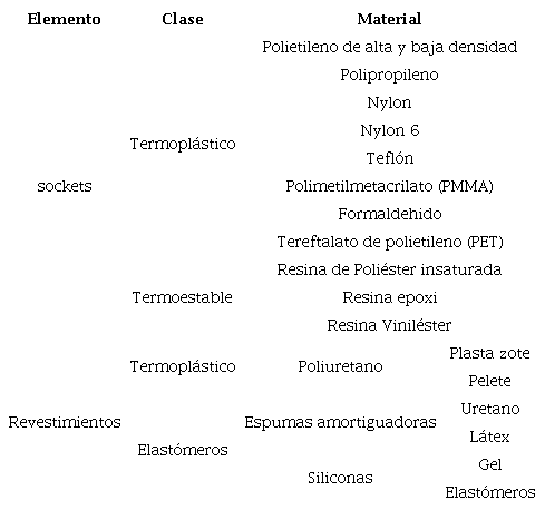 El uso de las prótesis de miembro inferior se relaciona con diversas enfermedades y afecciones de la piel como úlceras, quistes y dermatitis de contacto [7]; siendo uno de los mayores desafíos de estos dispositivos evitar o controlar los daños en la piel de los usuarios, a lo que se suma el deseo de aliviar el dolor del paciente, controlar las deformaciones, prevenir una excesiva amplitud de movimiento articular, protección de los tejidos y promoción de la cicatrización [18]. Para esto, se han desarrollado sockets o encajes de diversos materiales, especialmente de polímeros (ver Tabla 2) donde cada uno presenta sus ventajas y desventajas. Los termoplásticos son fáciles de moldear y ajustar, pero pueden ser menos duraderos y causar problemas en la piel si no se ajustan adecuadamente. Los termoestables son más resistentes, pero son más difíciles de moldear y ajustar. Las espumas y los geles proporcionan una buena amortiguación y comodidad, pero pueden ser menos duraderos y absorber el sudor, causando problemas en la piel. Los elastómeros son muy flexibles y duraderos, pero pueden ser menos cómodos debido a su rigidez [25].