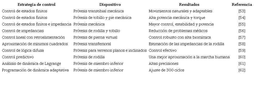 Es necesario resaltar que las estrategias de control utilizadas actualmente, aunque son efectivas, presentan deficiencias aún en el proceso de generación de una marcha mecánica y fisiológicamente cercana a la humana [9]. La Tabla 3 muestra un resumen de las técnicas de control de prótesis de miembro inferior, más empleadas en la actualidad.