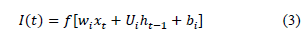 Where f represents the activation function ReLu, w¿ the matrix of synaptic weights, xt the input at time t, Ut the weight matrix of the previous output, ht-1 the output of the neuron at time t - 1, and bt the bias vector.