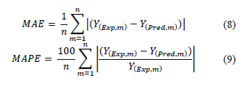 Where n represents the total number of input data, Y(Exp) the experimental value of the output, and Y(Pred) the value obtained with the intelligent model.