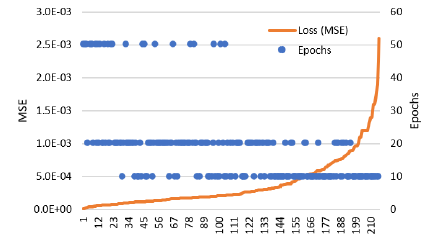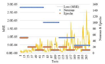 To determine the optimal operational values for the model, we examined the relationship between the number of epochs and the mean squared error (MSE) metric, as depicted in Figure 6. This analysis incorporated findings from previous assessments concerning the number of neurons in the system. To facilitate a clearer interpretation of the data, we arranged the results in ascending order of MSE.