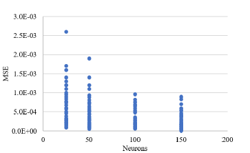 Figure 2 shows the behavior of the mean square error and its relationship with the varying parameters: number of neurons and number of epochs in the system. Higher number of neurons showed lower values of MSE. Lower values of epochs showed higher values of MSE. Note that during the development of the 216 tests, there was no marked trend in the behavior of the system, and a more detailed analysis of the performance of the model is required. To perform a more detailed analysis of the system performance results, it was proposed in Figure 3 to organize the MSE values from smallest to largest and compare them in the number of neurons to review the correlation between them and show the influence of this parameter on the model performance. Notice that with configurations with 150 and 100 neurons, better MSE performances are achieved in the system.