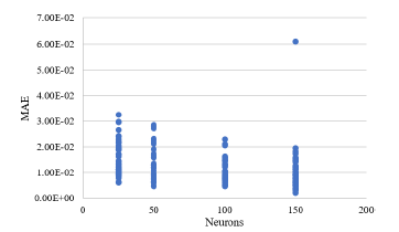 Figure 4 shows the correlation between the number of neurons implemented in the system and the result of the mean absolute error (MAE) metric. It can be seen that, unlike the results presented by the MSE, which were much more segmented, in this case, the values are very similar. However, it is possible to see a small difference between the systems with 150 and 100 neurons and those with 50 and 25, respectively.