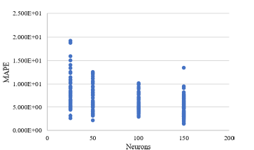 This analysis supports what was mentioned in Table 2. MAPE results were compared with the number of neurons present in the system, as shown in Figure 5. Similar to previous results, the configurations with 150 and 100 neurons in their internal structure exhibited less error during training. The configurations with 50 and 25 neurons were not poorly designed, they simply demonstrated lower efficiency compared to their counterparts.