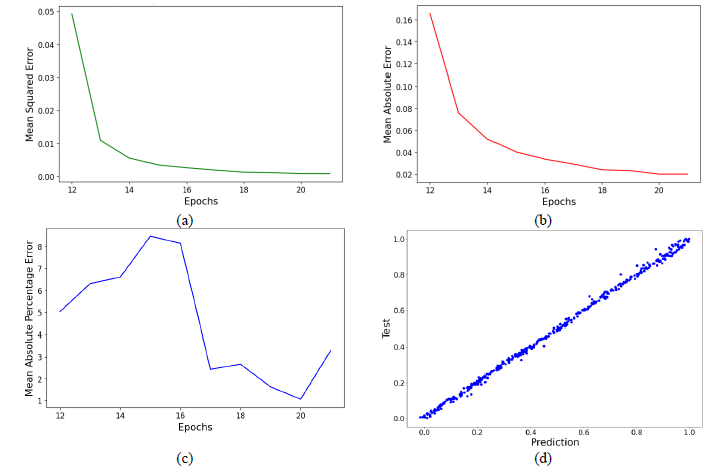 Figure 7 displays four performance graphs of the chosen model. These graphs compare the number of epochs to the mean squared error (MSE), mean absolute error (MAE), and mean absolute percentage error (MAPE), and illustrate the alignment between the predictions of the model and the test data.
