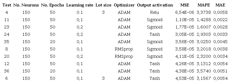 Table 2 shows the 10 configurations with the best MSE, structured in their hidden layers with 150 neurons. The results show that with this type of configuration an MSE of 6.5416E-06 can be achieved, as well as an MAE of 0.0058 and an MAPE of 3.3738%.