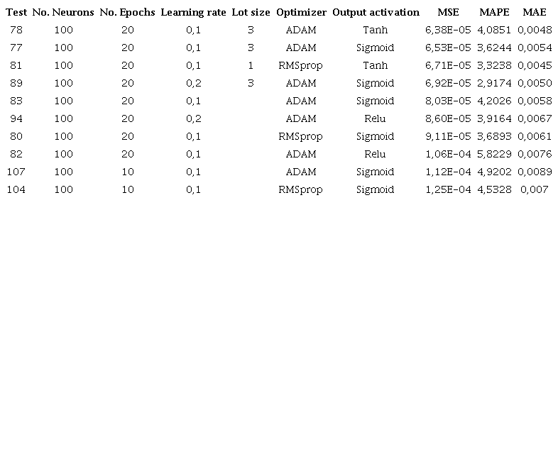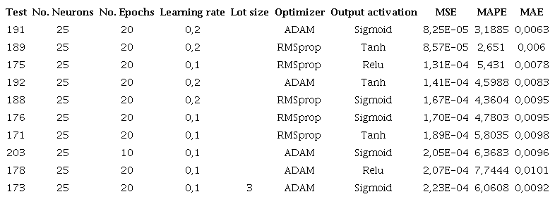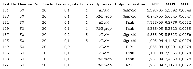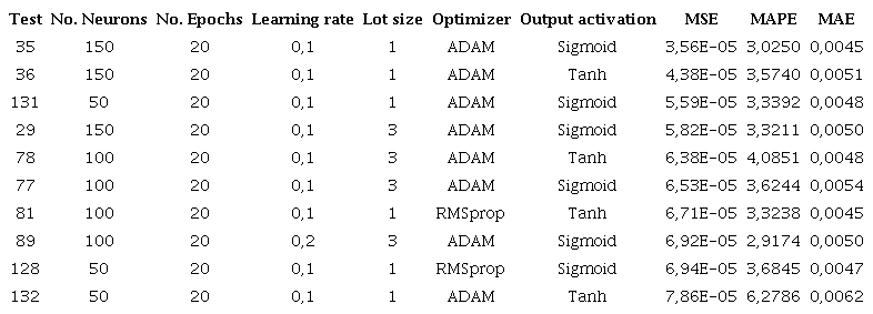Table 4 shows the results for the 10 configurations with the best MSE, considering 50 neurons in the hidden layer. The system presents a behavior where, in comparison with Table 3 the values of the MSE and MAPE present an increase, reaching in this case 5.59E-05 and 3.33%, respectively, while the MAE remains stable. This comparison still does not exceed the performance presented in Table 2. On the other hand, notice that the model has better performance in this configuration when using a batch size of 1 as well as a learning rate of 0.1 by performing 20 epochs in the process and implementing. On the other hand, notice that the model has better performance in this configuration when using a batch size of 1 as well as a learning rate of 0.1 by performing 20 epochs in the process and implementing activation functions such as sigmoid and hyperbolic.