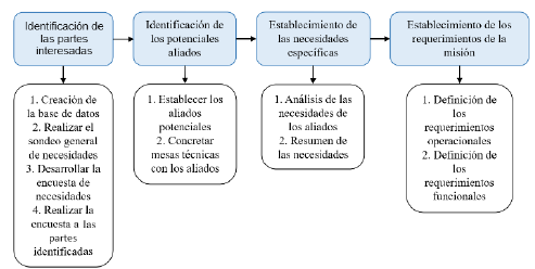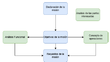 La determinación de los requisitos generales en misiones espaciales se lleva a cabo a través de diversas metodologías. En el pasado, estos requisitos se han delineado principalmente a partir de los objetivos de la misión. Sin embargo, en enfoques más contemporáneos, se reconoce la importancia de considerar las necesidades de las partes interesadas como un elemento fundamental en este proceso. Para lograrlo, se requiere realizar un análisis exhaustivo de estas necesidades, lo que se convierte en un paso esencial en la definición de los requisitos de la misión. Una vez completado este análisis, se procede a realizar un estudio operacional y funcional de las necesidades identificadas, lo que a su vez conduce a la formulación precisa de los requisitos que guiarán el desarrollo y la ejecución de la misión [12], [13].